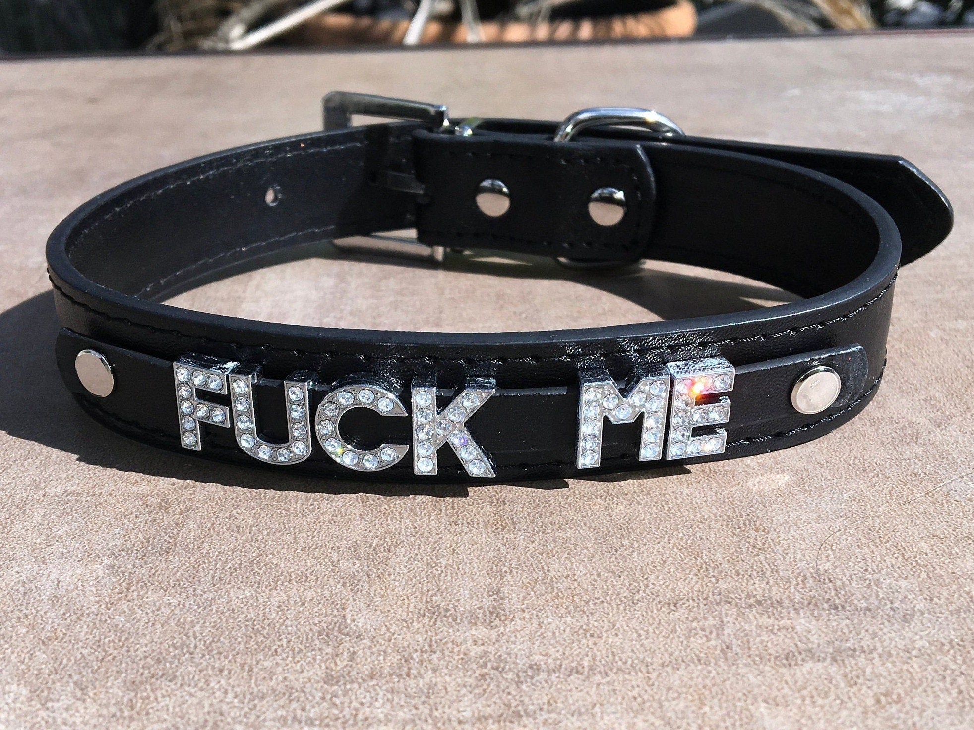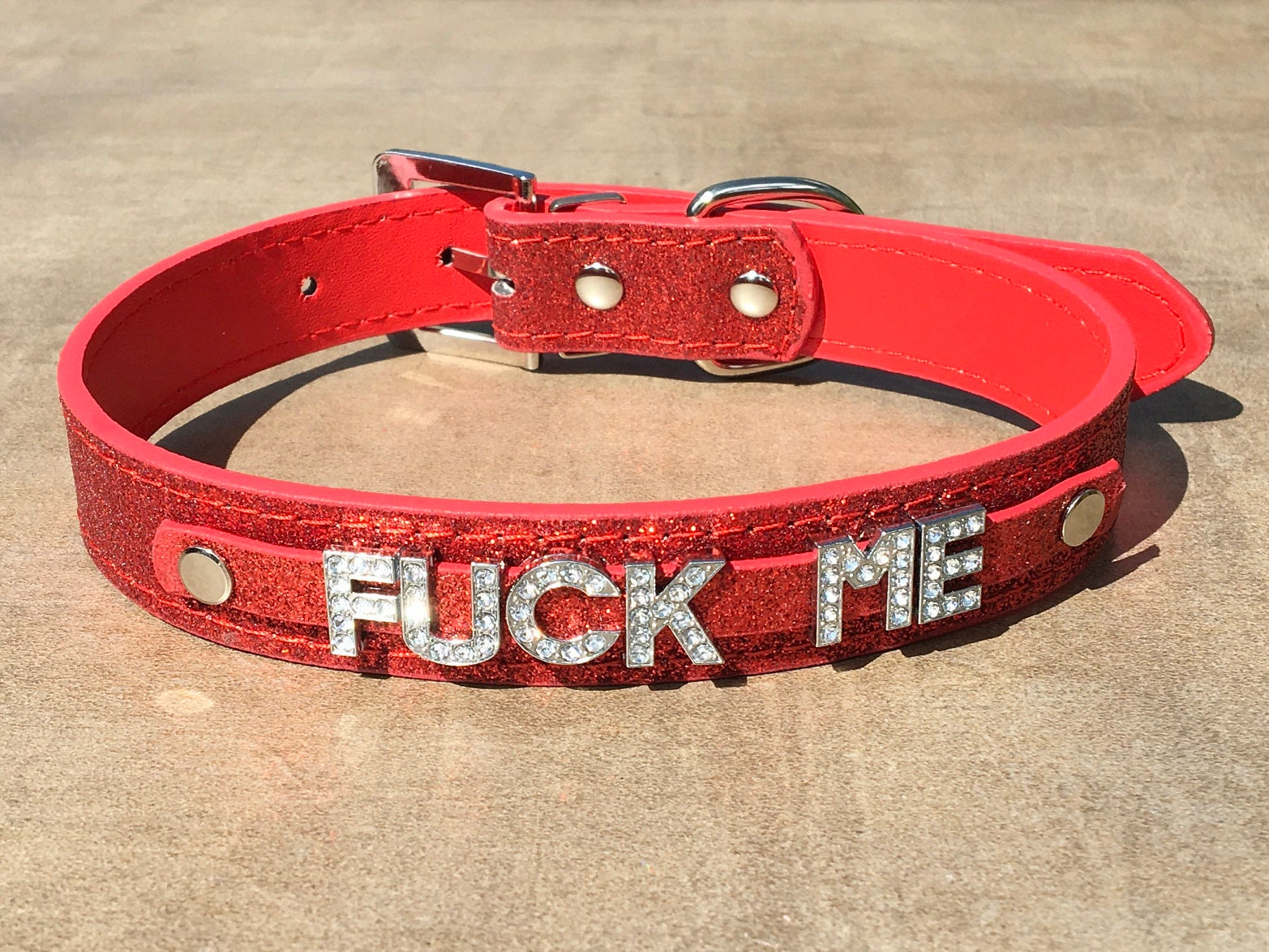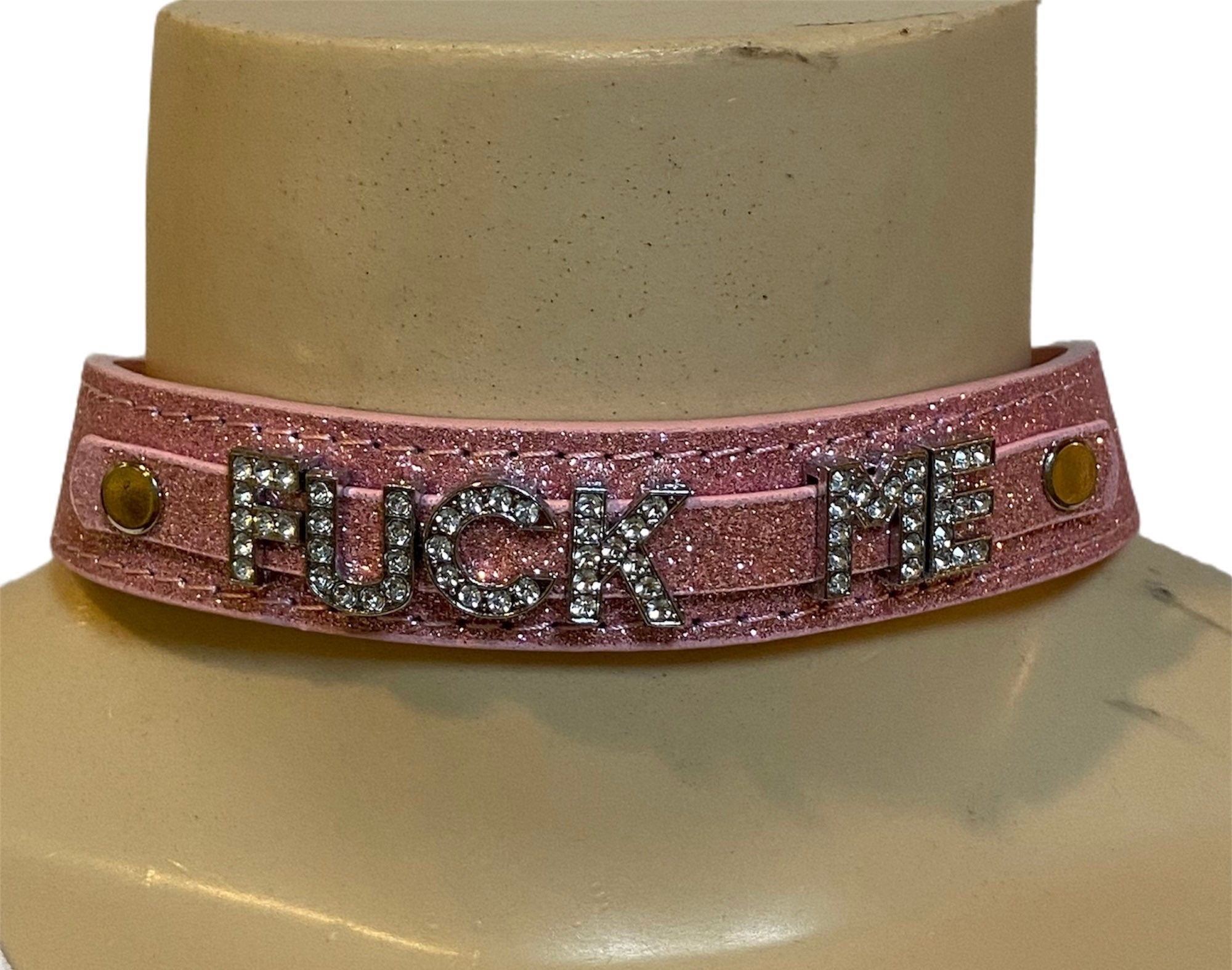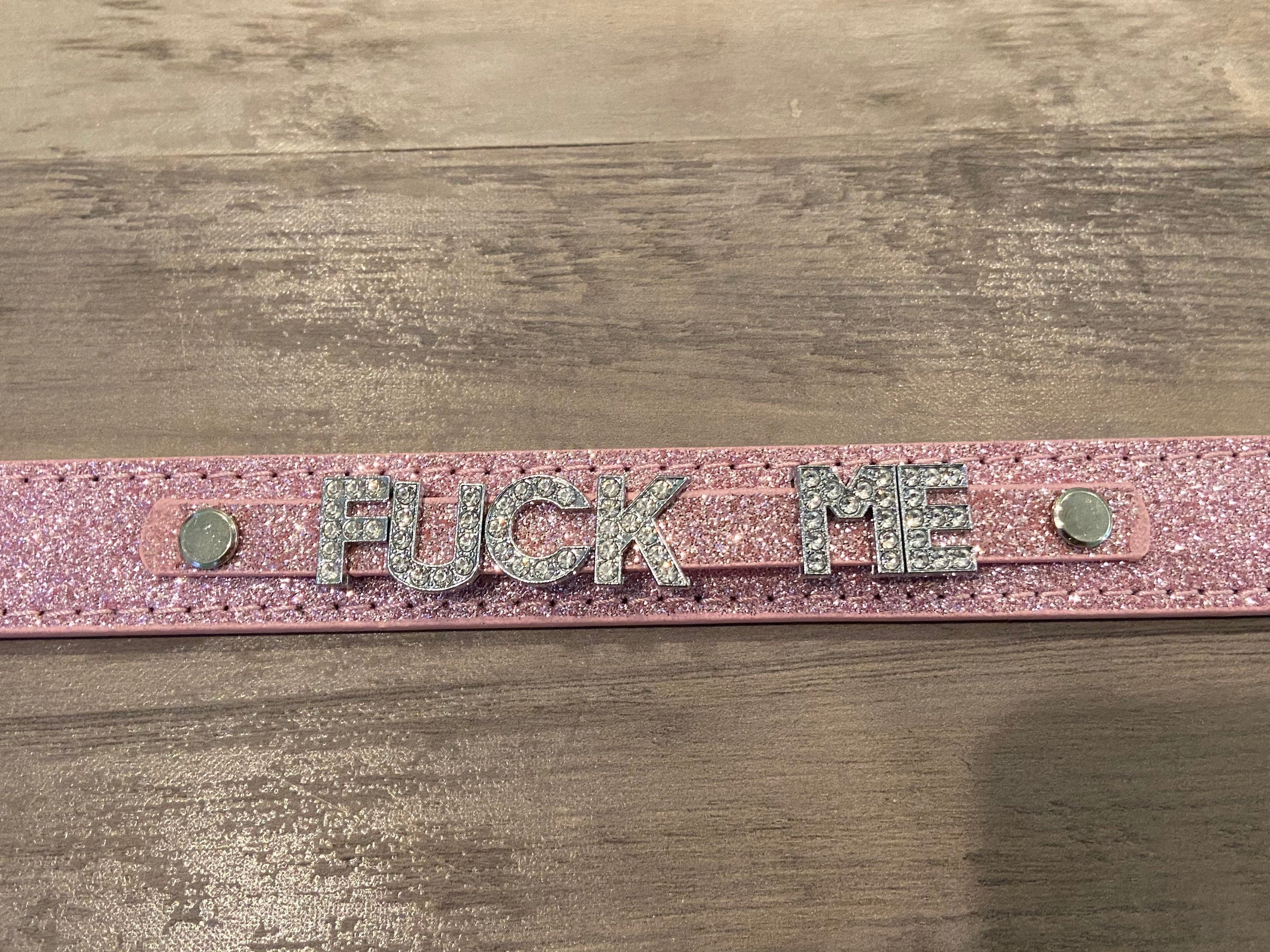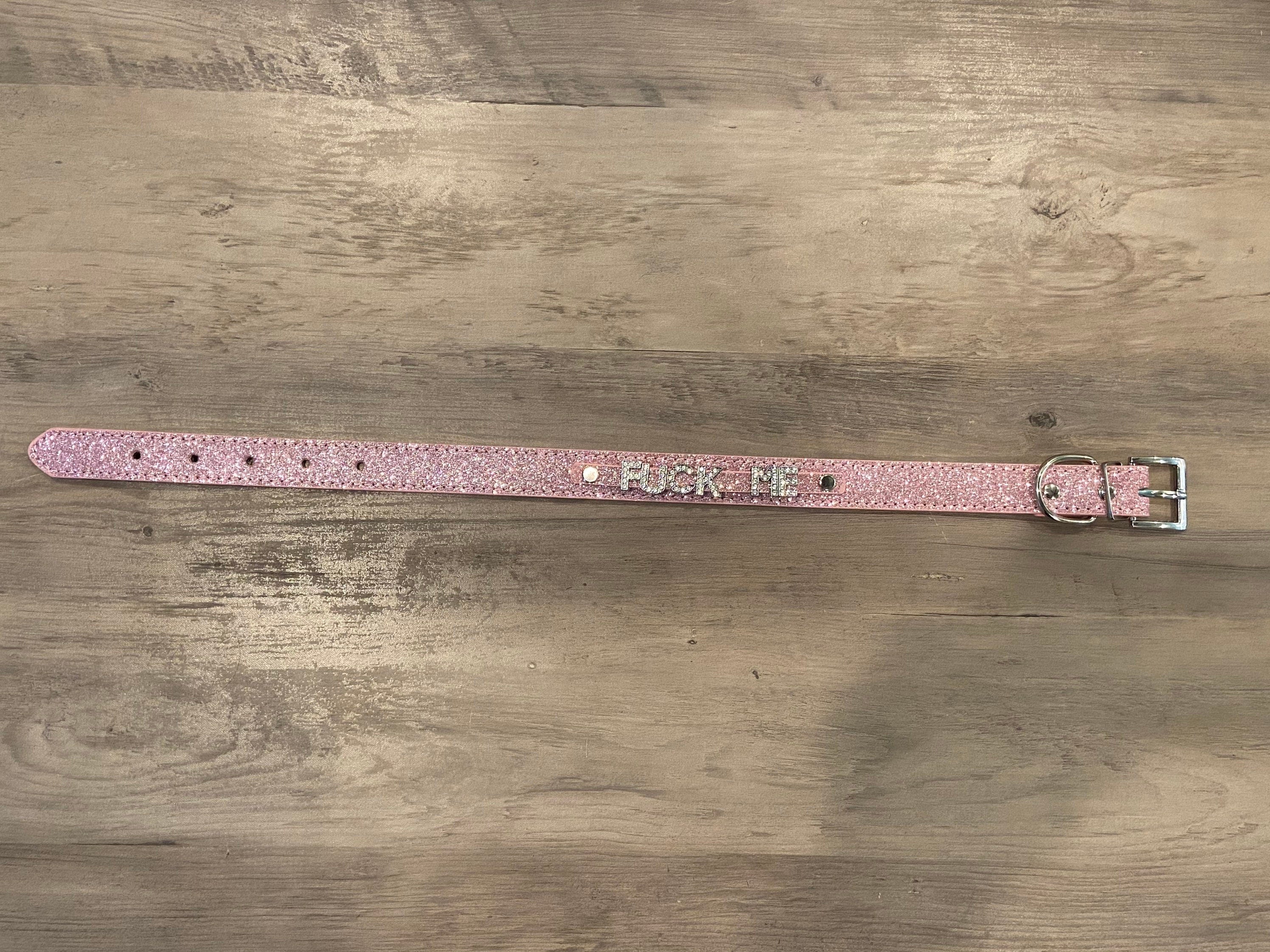 It features rhinestone letters that spell out “fuck me” and is available in solid (not sparkly) black, sparkly hot pink, sparkly light pink, and sparkly red. Each collar features a D-ring so you can add a leash to keep your baby girl close.